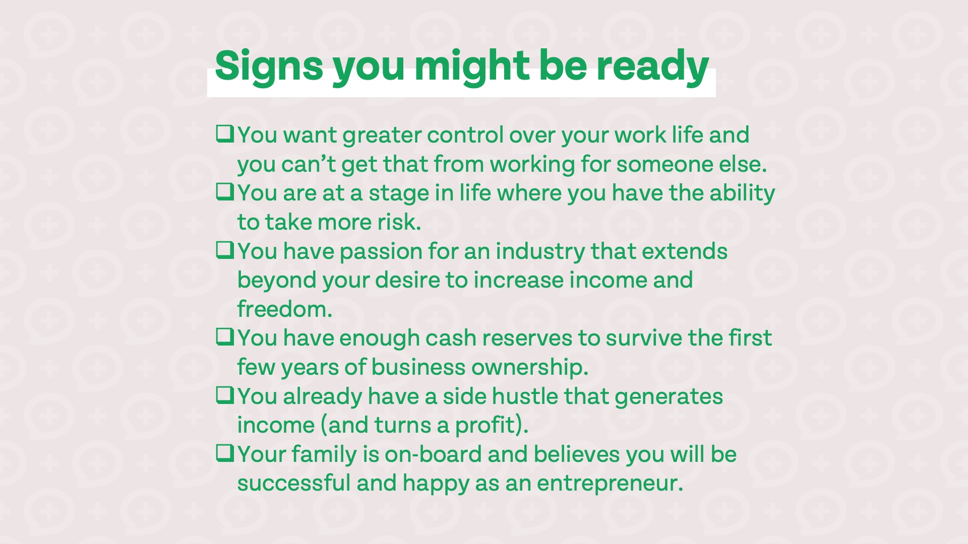 - Your family members are on-board and believe you will be successful and happier as an entrepreneur.