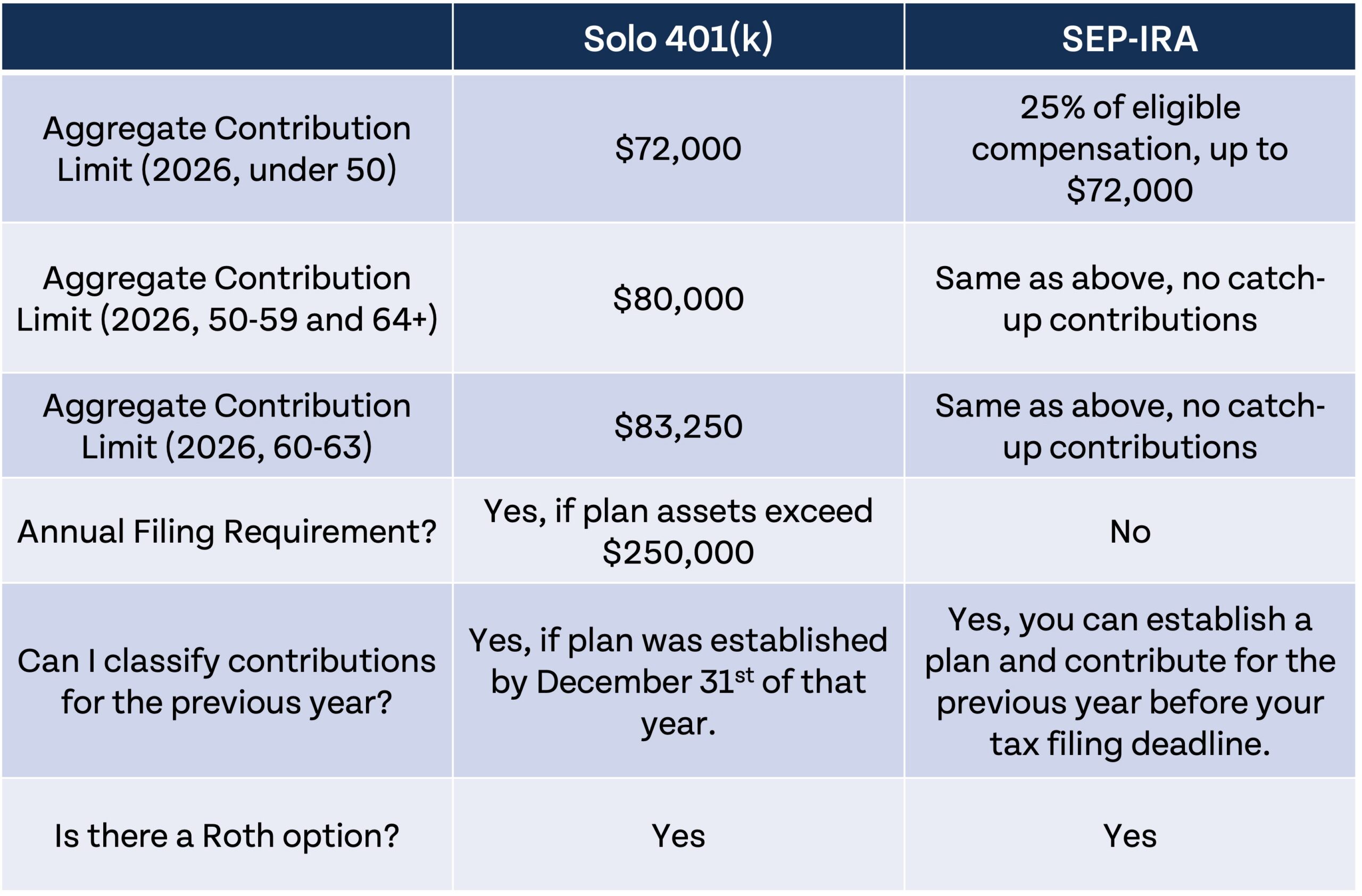 Solo 401(k) plans are best for most entrepreneurs. They have higher contribution limits for many small business owners since the contribution limit isn’t tied to eligible compensation like with SEP-IRAs. SEP-IRAs are easier to set up and have fewer reporting requirements. Check out the table below to compare the differences between solo 401(k)s and SEP-IRAs.